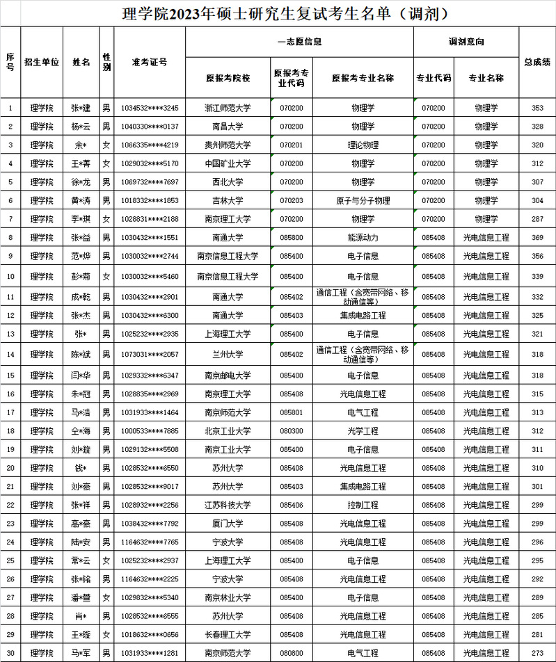 2023年理学院物理学、光电信息工程专业调剂复试考生名单20230406