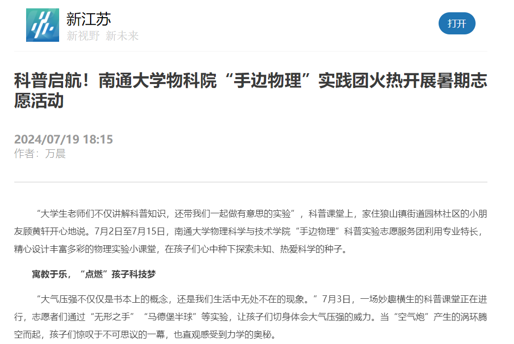 6月28日—7月15日,“手边物理”科普实验志愿服务团分别走进通州区十总中学和崇川区园林社区开展物理实验小课堂。从“光的直线传播实验”到“三棱镜色散实验”,在志愿者的讲解和指导下,孩子们亲手操作并见证光的折射、反射、色散等现象,感受斑斓多彩的光魅力;在声学实验中,大学生们讲解了声音录制与声学原理,让孩子们在感受音乐之美的同时,也学到了声学知识。除科普实验外,服务团还精心策划专题公益活动,涵盖专题讲座、安全教育、心理健康等专题,以丰富多彩的夏日活动为载体,促进未成年人健康快乐成长。