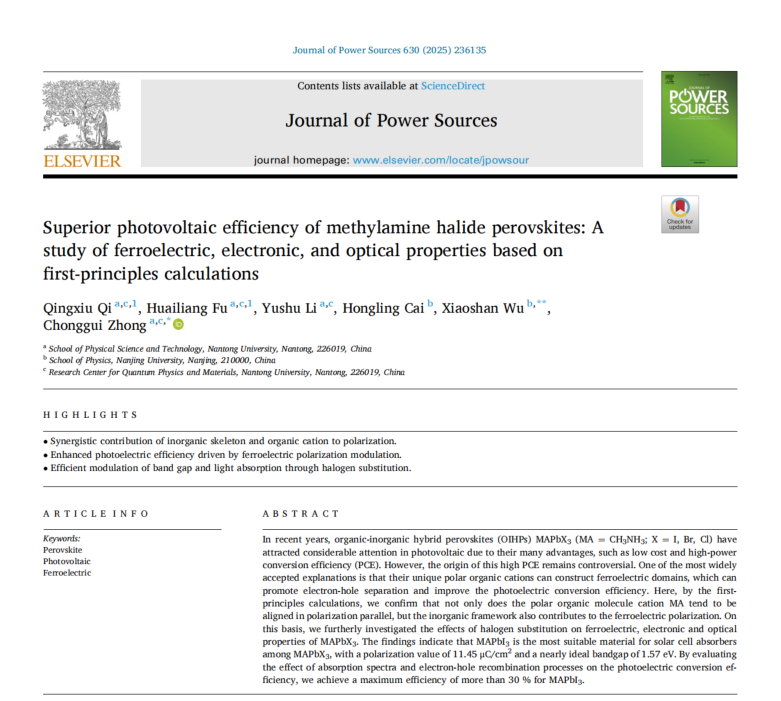 近日,我院仲崇贵教授课题组在MAPbX3(X=I, Br, Cl)钙钛矿太阳能电池的理论研究方面取得新进展。相关研究成果以《Superior photovoltaic efficiency of methylamine halide perovskites: A study of ferroelectric, electronic, and optical properties based on first-principles calculations》为题发表在《Journal of Power Sources》上,免费游戏 仲崇贵教授和南京大学吴小山教授为共同通讯作者,我院2022级物理学硕士生戚清秀为该论文第一作者,免费 游戏 试玩 免费畅玩趣味游戏 为第一单位。