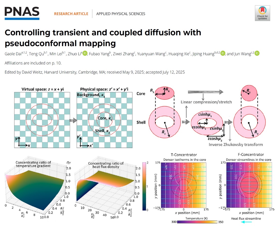 近日,免费游戏 戴高乐博士与和合作者在扩散调控与扩散超材料设计方面取得新进展,相关研究成果以“Controlling transient and coupled diffusion with pseudoconformal mapping(通过赝共形映射控制瞬态和耦合扩散)”为题发表于《美国国家科学院院刊》(Proceedings of the National Academy of Sciences of the United States of America,简称为PNAS),免费游戏 为第一署名单位。戴高乐博士、复旦大学黄吉平教授和上海第二工业大学王骏副教授为共同通讯作者。戴高乐博士、复旦大学本科生屈腾、复旦大学博士研究生雷敏为共同第一作者。