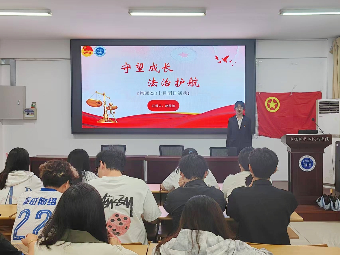 为深入学习贯彻习近平法治思想,提高校园法治宣传教育实效,增强青年学生法治观念,引导学生尊法、学法、守法、用法,让法治精神浸润校园每一处角落,10月14日,免费游戏 团委主办、物师233团支部承办了“守望成长,法治护航”主题团日活动。