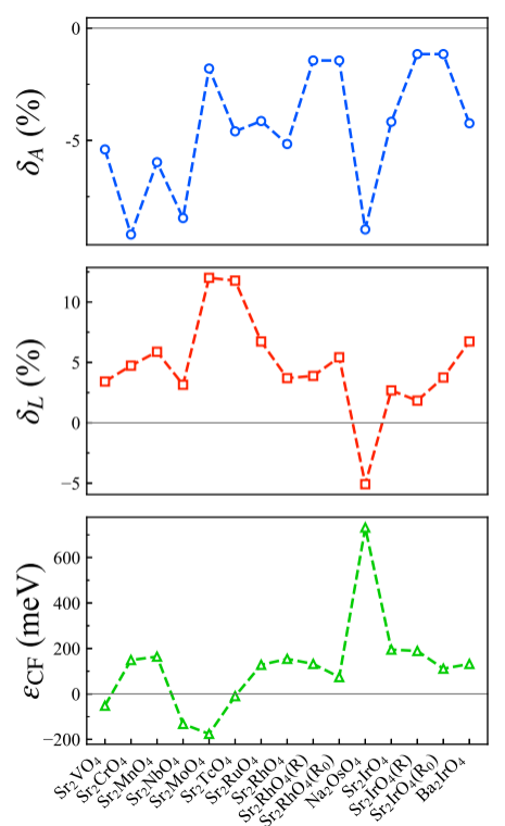 层状钙钛矿材料因非传统超导、自旋-轨道Mott绝缘态、Hund金属行为及各种新奇的电荷、自旋、轨道序而备受关注。晶体场劈裂是理解这些新奇现象的“基因”性参数。在构建低能有效模型来描述这些材料中的关键物理时,人们通常基于过渡金属最近邻配体构成的八面体的畸变来估算晶体场劈裂的大小和符号(传统晶体场理论)。但近年来在一些被广泛关注的层状钙钛矿材料(如 Sr2IrO4和 Sr2CrO4)中,人们发现真实的晶体场劈裂符号与传统晶体场理论预测相反。这种反常现象在层状钙钛矿材料中是否普遍仍然未知。研究团队针对这一问题,通过第一性原理计算对一系列实验上能够制备的层状钙钛矿材料进行了详细的研究。结果表明,晶体场劈裂的“符号反转”并非个别材料所特有,而是在层状钙钛矿体系中非常普遍(common),尤其是在t2g体系中更为明显(如图所示),在部分eg体系中也可观察到;更为重要的是,即使在理想无畸变结构中,层状结构本身也会导致较大的非零晶体场劈裂(“隐式反常”)。研究团队深入地探究了导致这些反常现象的背后物理机制。他们发现,在出现显式反常(符号反转)的体系中,层状结构与A位立方体的压缩合作,在和局域八面体拉伸的竞争中占据主导地位,最终导致了与传统晶体场理论预期相左的结果;而层状结构本身导致的非零晶体场主要来源于两个方面:(1)过渡金属d轨道和配体p轨道间电荷转移能的各向异性,(2)长程静电库仑相互作用。